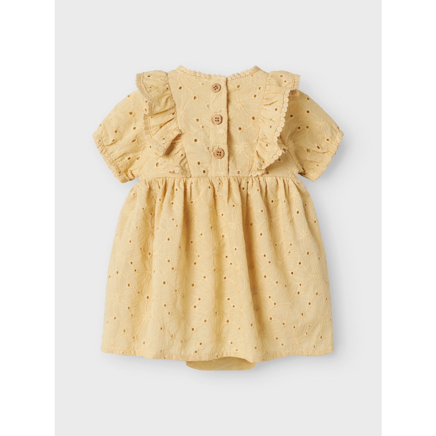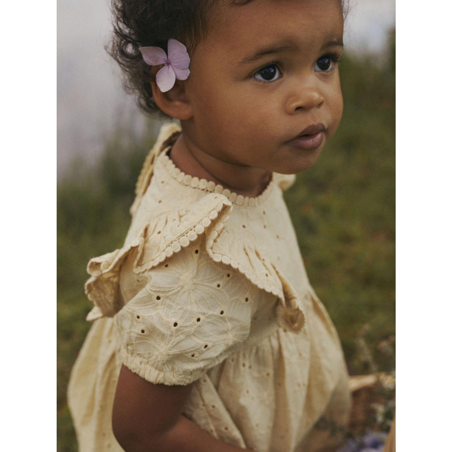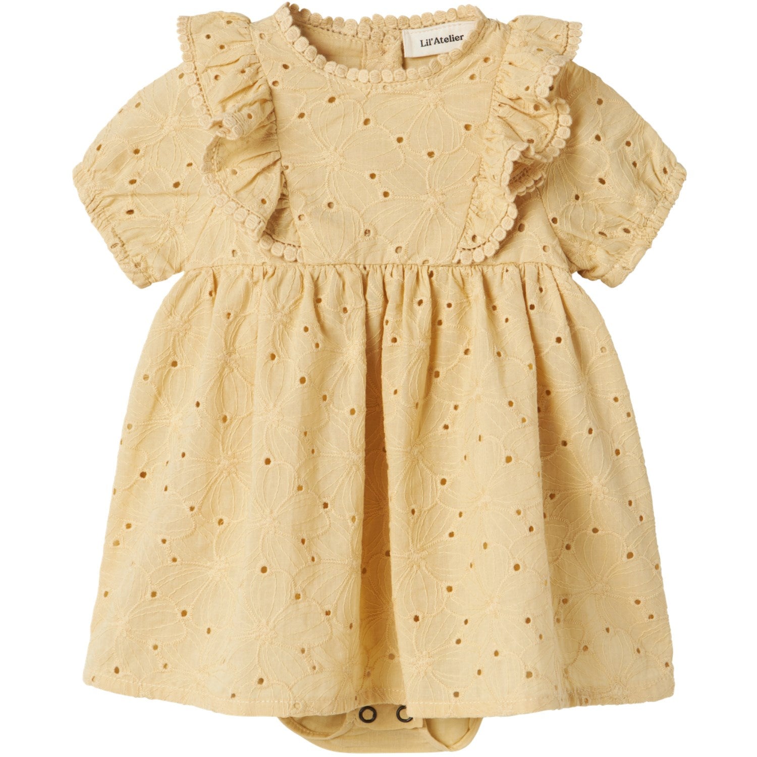 Frisk opp den lille sin garderobe med den sjarmerende Lil'Atelier Sea Mist Fabioli Loose Body Kjole. Denne kjolen er laget i vevd materiale med et distinkt kryss og tvers-mønster, som gir en lett, strukturert følelse. Med sin løse passform og korte ermer utstyrt med elastiske mansjetter, tilbyr den god komfort og bevegelsesfrihet. Rund hals og praktiske trykknapper samt knappelukking bak sikrer enkel påkledning. Kjolen bærer også vakre detaljer som frills og blondedekorasjoner. Den rene og klassiske stilen gjør den ideell for både hverdags og fest. Pleieinstruksjoner inkluderer at den bør holdes unna brann og tåler vanlig vedlikehold for langvarig bruk.