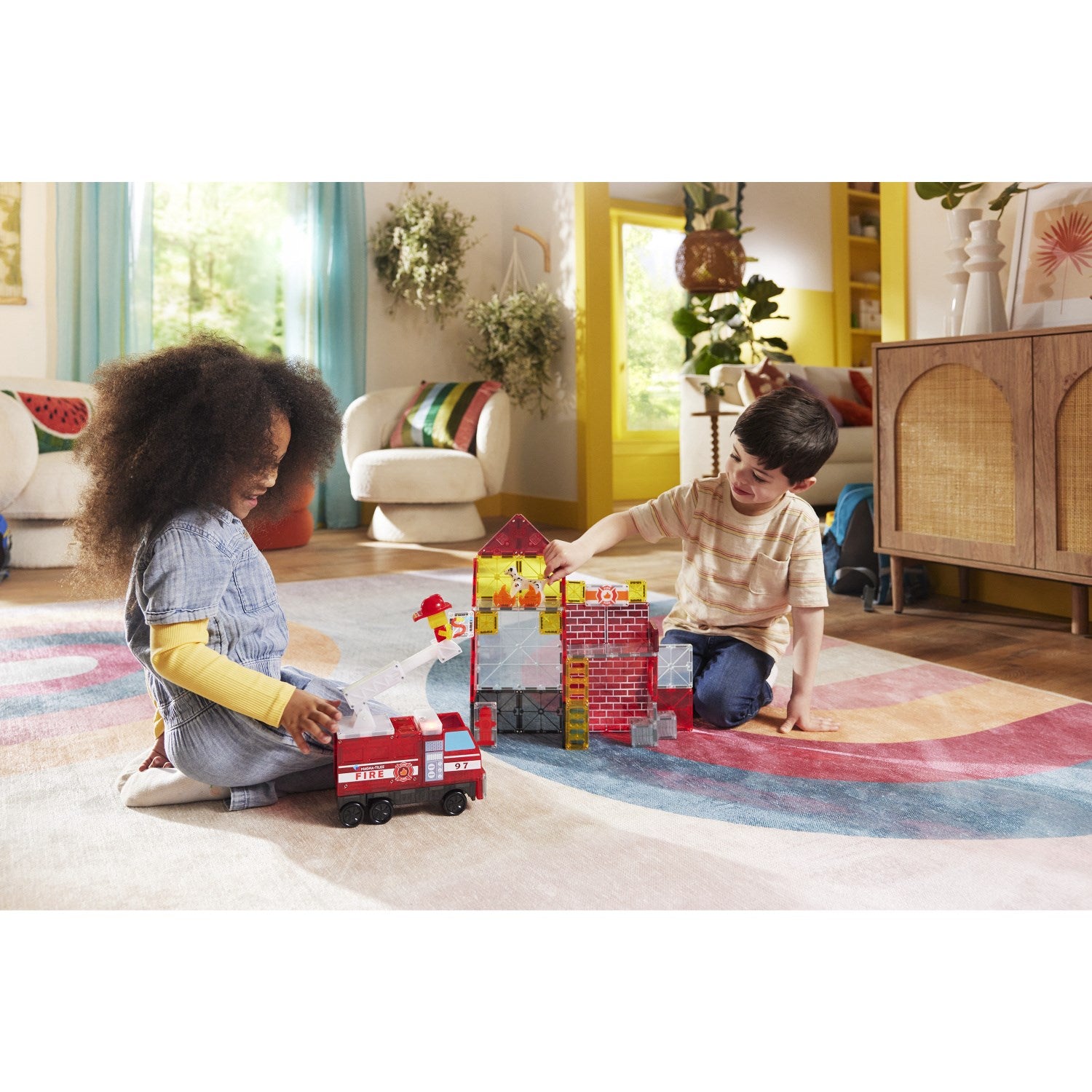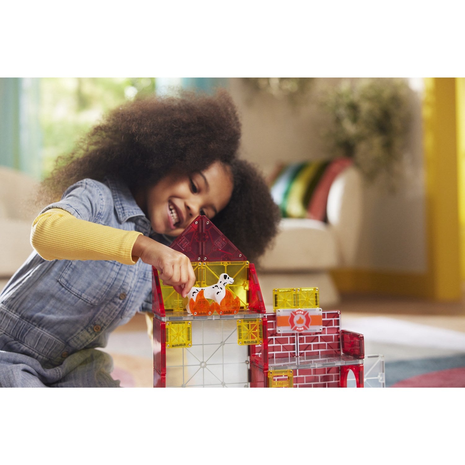 • 50 magnetiske deler, inkludert en miks-og-match-brannmannfigur, lys- og lydfliser, og en uttrekkbar brannbilstige.