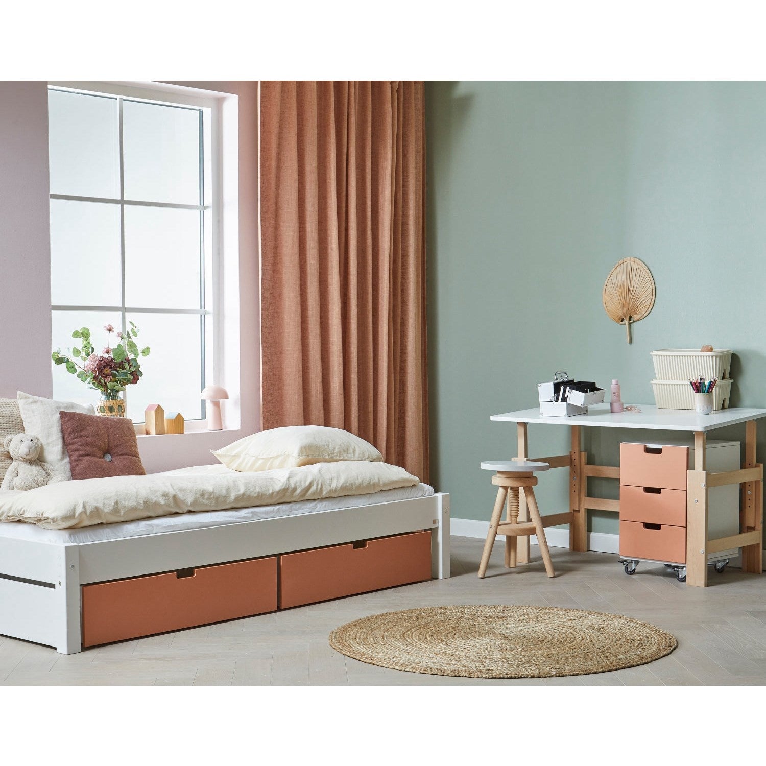Gi barnerommet et friskt og funksjonelt løft med Manis-h Snow White Ull Briks, den perfekte enkeltsengen for voksende barn. Denne sengen kombinerer klassisk design med moderne behov, og har en lamellert base samt to romslige skuffer med barn-vennlige myke håndtak. Skuffene tilbyr praktisk lagringsplass for alt fra leker til sengetøy, noe som hjelper til med å holde rommet ryddig og innbydende.