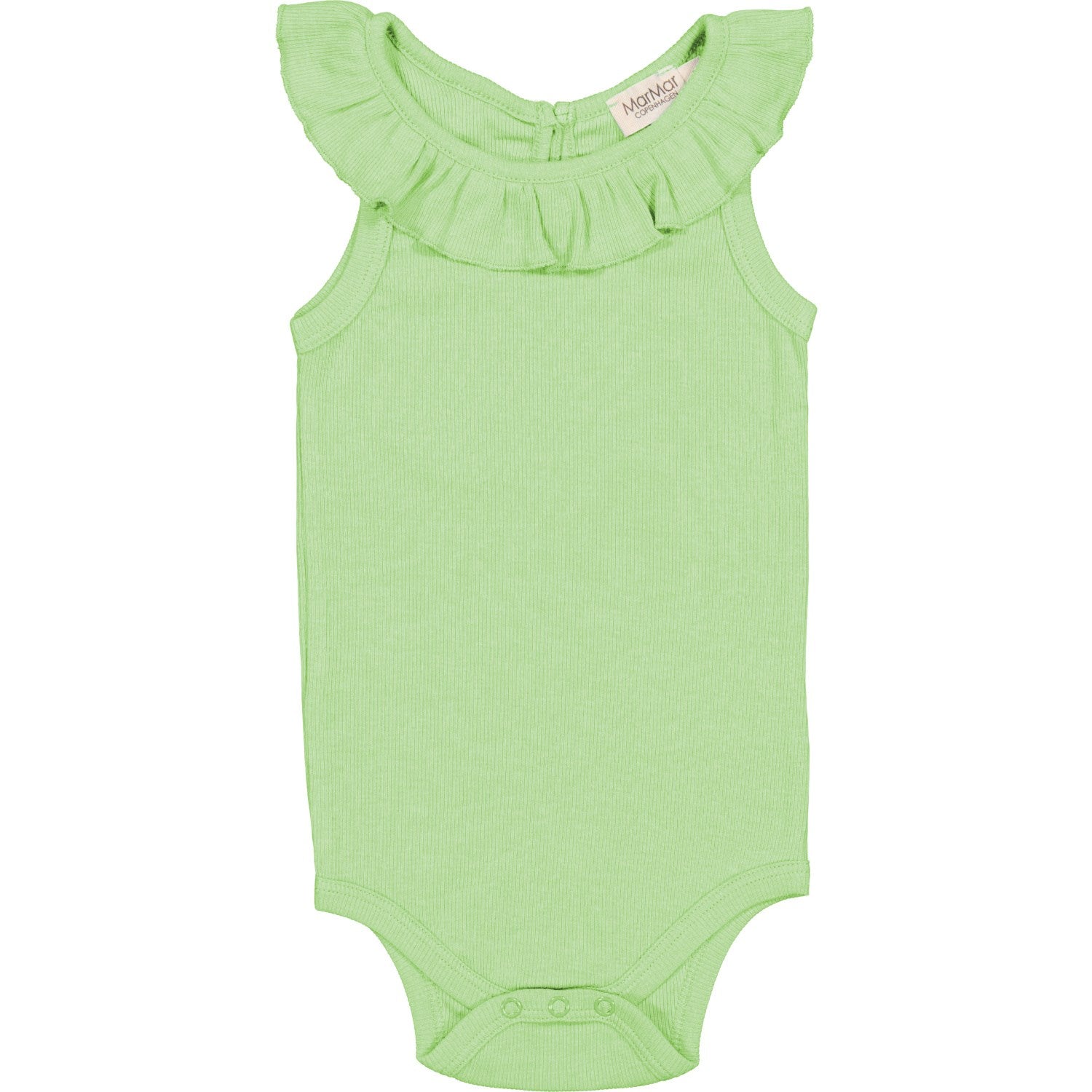 Bodystockings fra MarMar Copenhagen er et must-have for de minste. Den ermeløse bodyen har en søt volang og praktisk knappelukking i nakken, og lukkes mellom bena for enkle bleieskift. Den smale ribbestrikkede strikken med elastan gir en komfortabel og elastisk passform. Den pustende kvaliteten sikrer optimal komfort, mens den høye kvaliteten holder formen og fargen vask etter vask. Oeko-tex-sertifisering® garanterer at produktet er testet for skadelige kjemikalier. Kjøp denne MarMar Modal Fine Rib Clover Brianna Body og skjem bort barnet ditt med stilige og komfortable klær! I'm sorry, but it seems like I couldn't find any text to generate a bullet point list for you. Could you please provide me with the text so that I can assist you in creating the requested list?