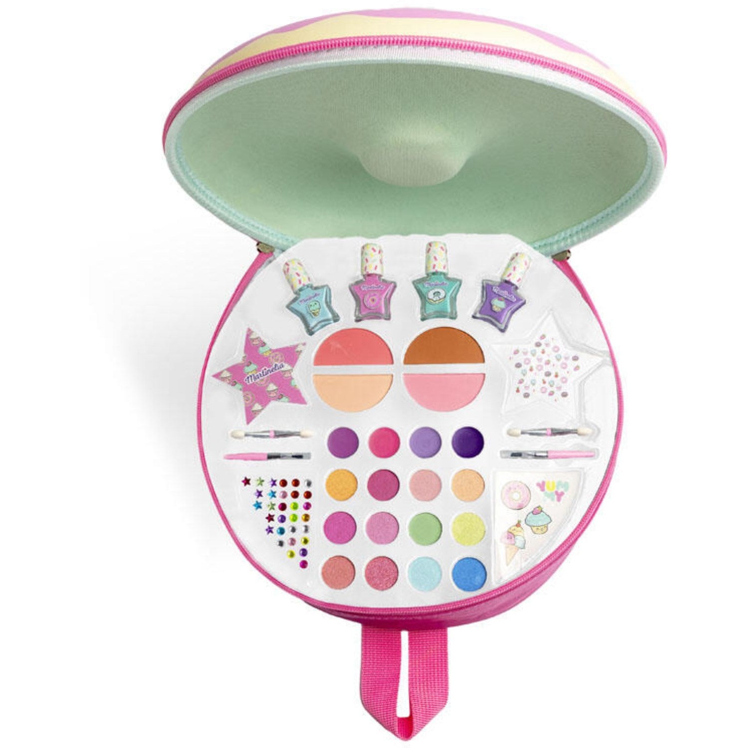 Oppdag den sjarmerende Martinelia YUMMI Donut Dream Rygsekken, perfekt for kreative barn! Inneholder en rikholdig sminkepakke med alt fra øyenskygger og lipgloss til neglelakk og tatoveringer. Denne ryggsekken byr på underholdende og lærerike stunder, hvor barna kan utforske skjønnhet på trygt vis. Lett å bære med seg og enkel å rydde bort, dette sørger også for at små skatter holder seg organisert. Ideal til både hverdagsbruk og lekeavtaler! Mål: 29x9x29 piksler