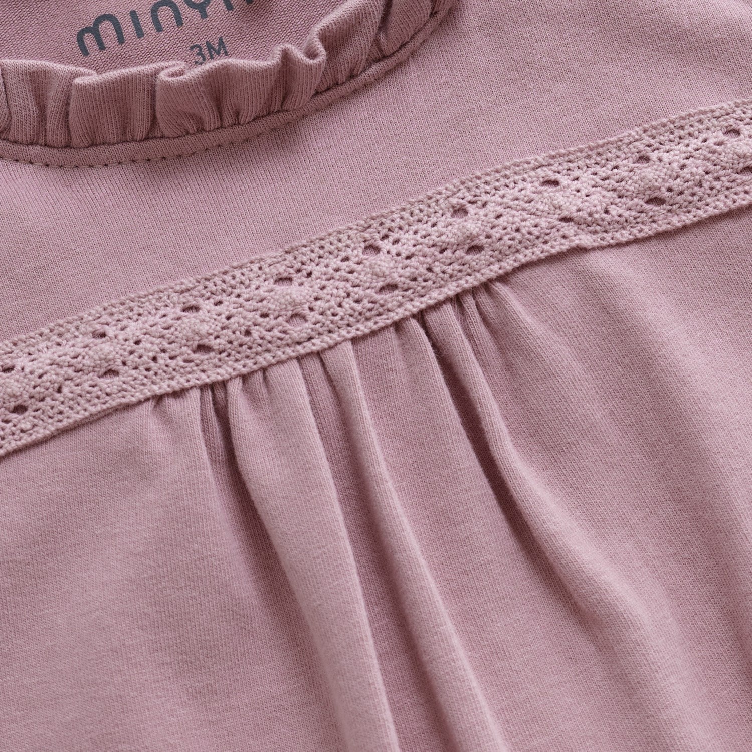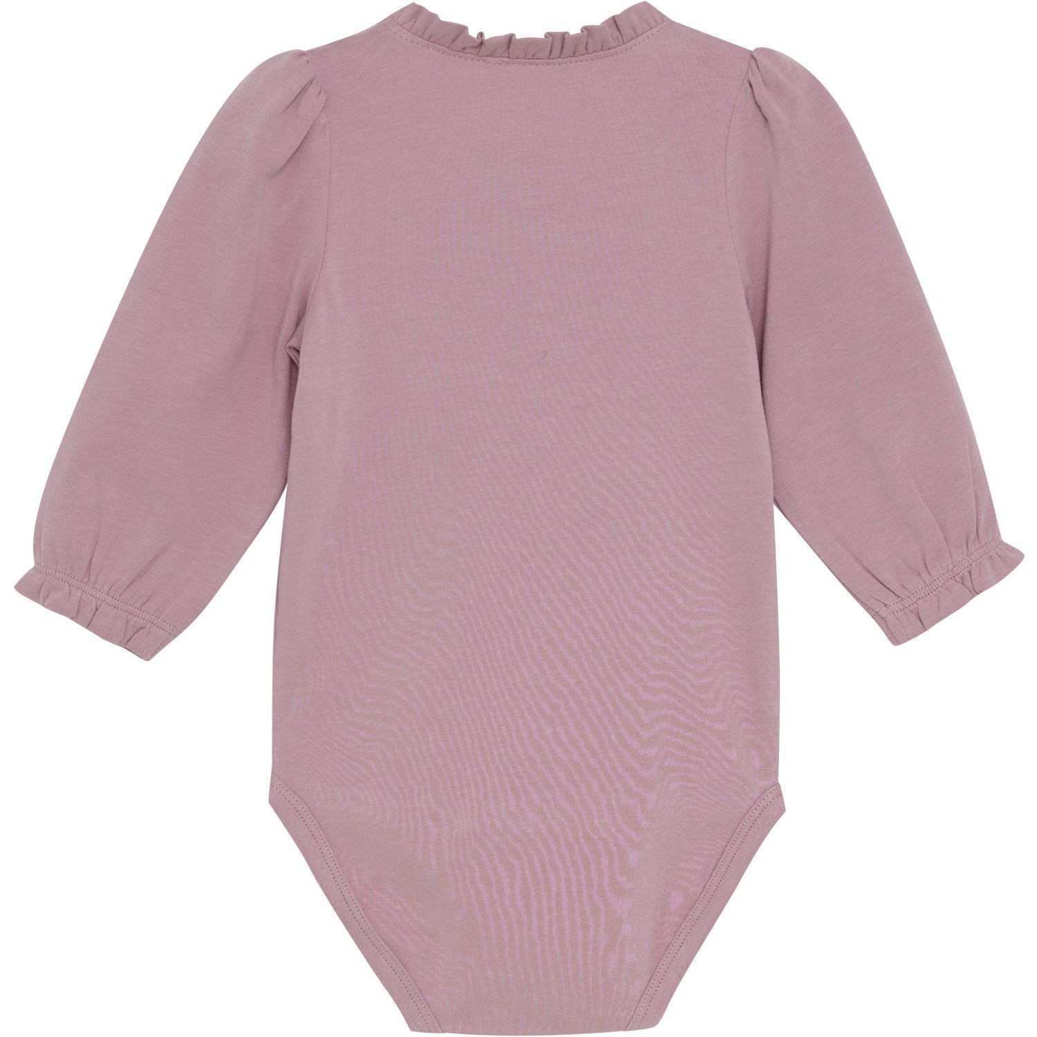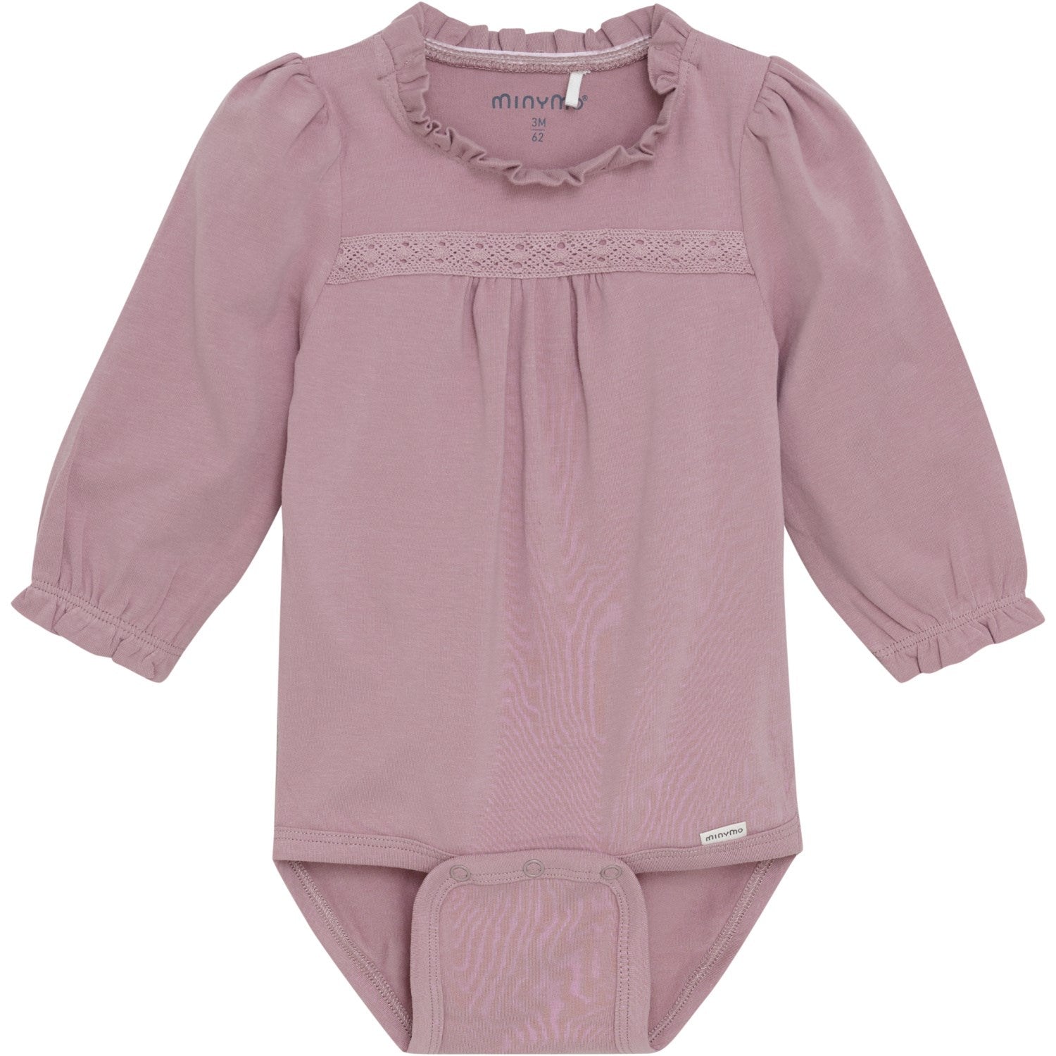 Oppdag den sjarmerende langermede bodyen fra Minymo i delikat woodrose-farge. Denne bodyen er ikke bare praktisk med sine trykknapper mellom bena for enkel på- og avkledning, men også stilfull med sine dekorative folder på brystet, kragen, skuldrene og ved håndleddene. Et diskret broderi over brystet tilfører en ekstra touch av eleganse. Laget av en myk bomullsblanding, garanterer den komfort og god passform, samtidig som den er lett å vedlikeholde. Perfekt for daglig bruk eller spesielle anledninger.