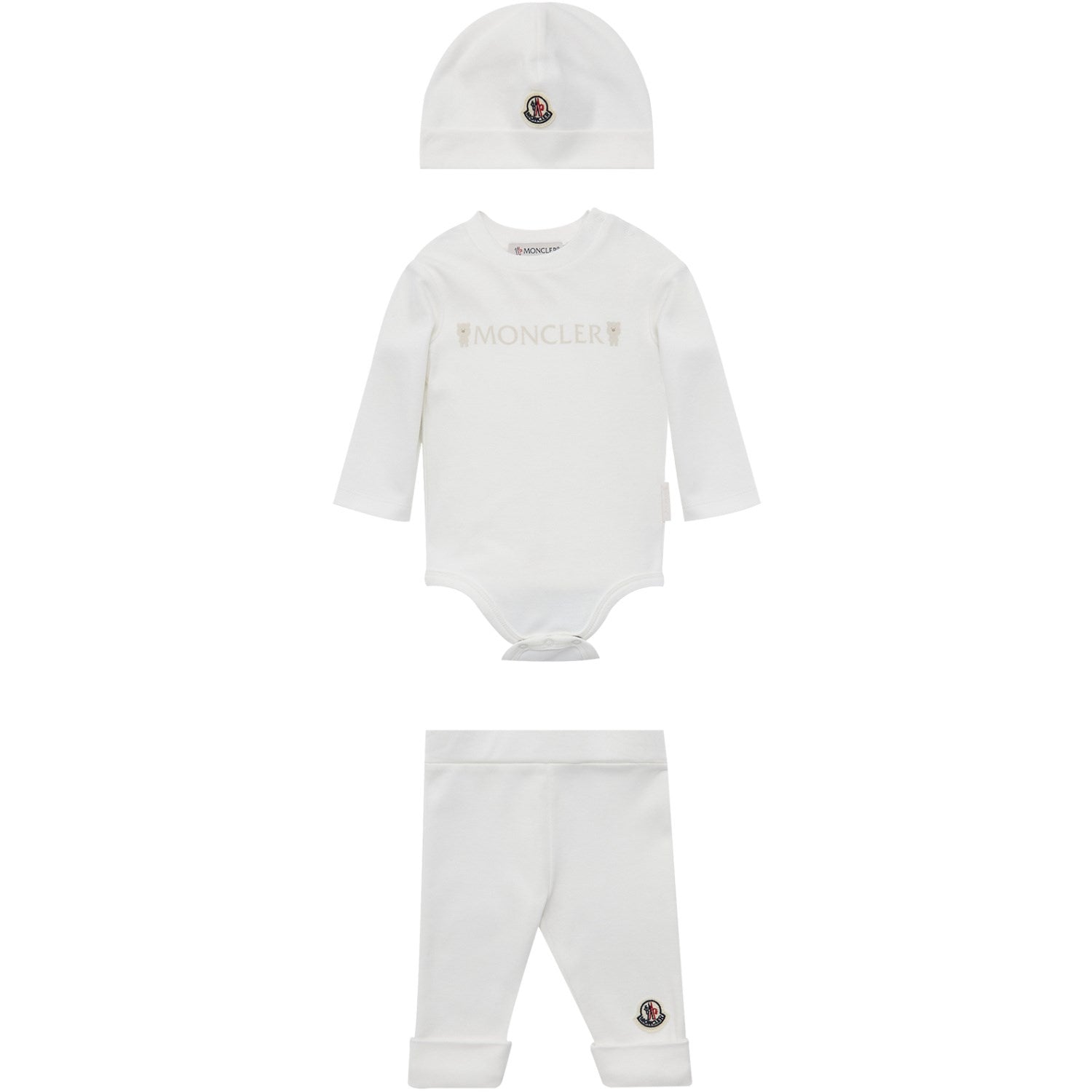 Kle den lille i bedårende luksus med vår Moncler Light Beige Sett bestående av bodysuit, bukser og lue! Utsmykket med sjarmerende bamsetrykk, inkluderer dette settet en koselig langermet romper med praktiske trykknapper, elastiske leggings med elastisk midje for komfort og en stilig lue med Monclers ikoniske logo. Perfekt for å holde babyen din lun og fasjonabel fra topp til tå!