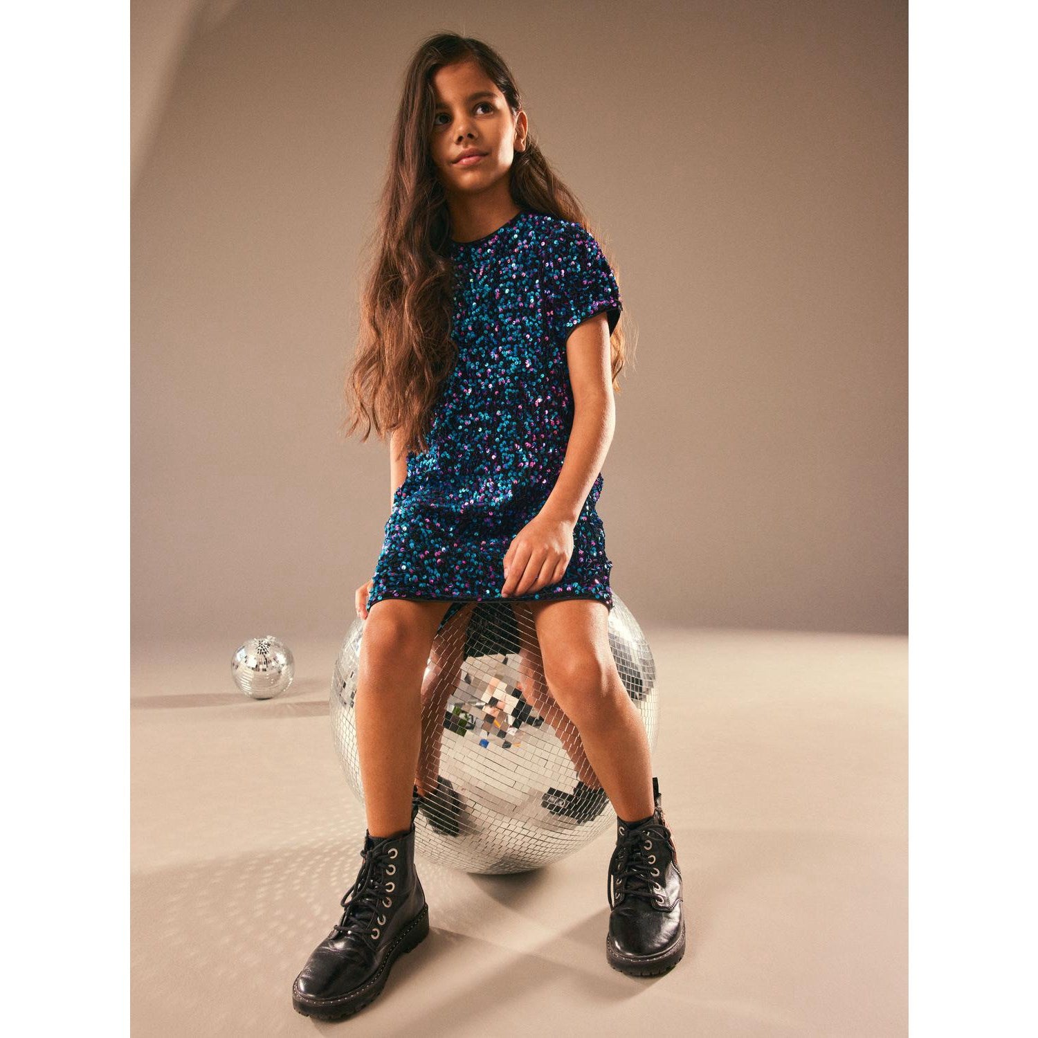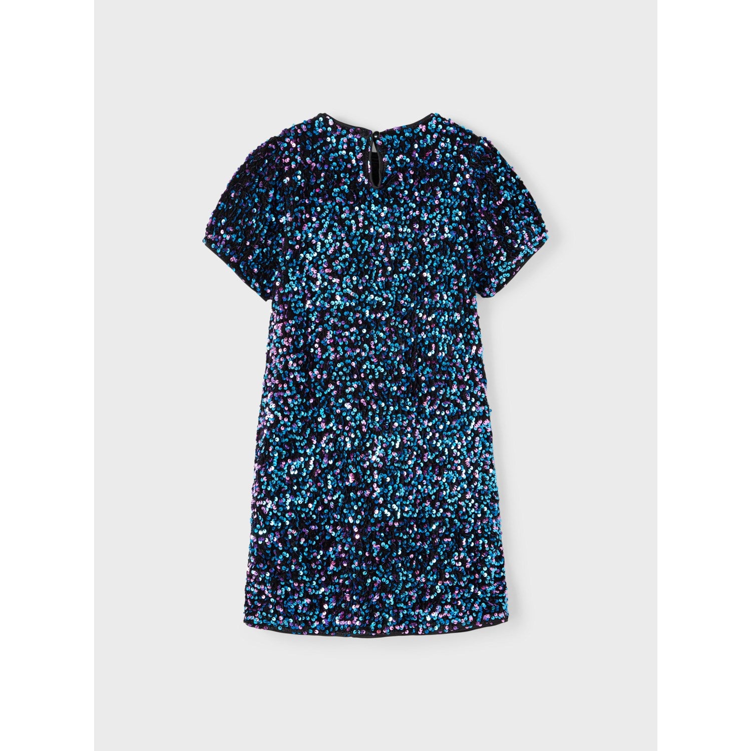 Fargen svart sammen med dekorative paljetter legger et touch av glam til kjolen, og gjør den til et blikkfang i enhver sammenkomst. Kjolen er designet med en normal passform og kort lengde, som passer flott for lekne barn som alltid er på farten. Den lette strukturen i stoffet, sammen med slitestyrken, gjør denne kjolen både praktisk og flott til gjentatt bruk, uten å miste sin sjarm.