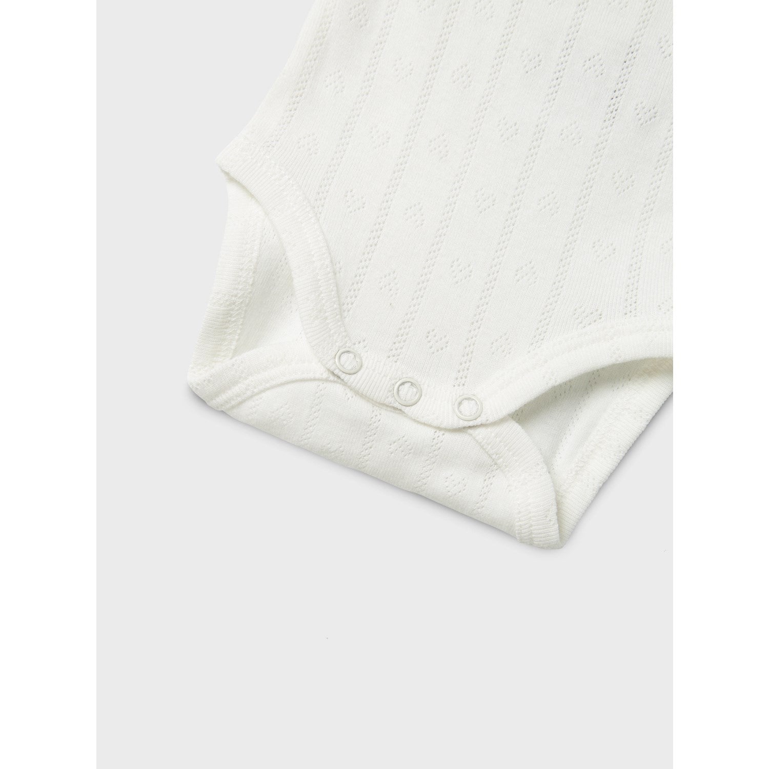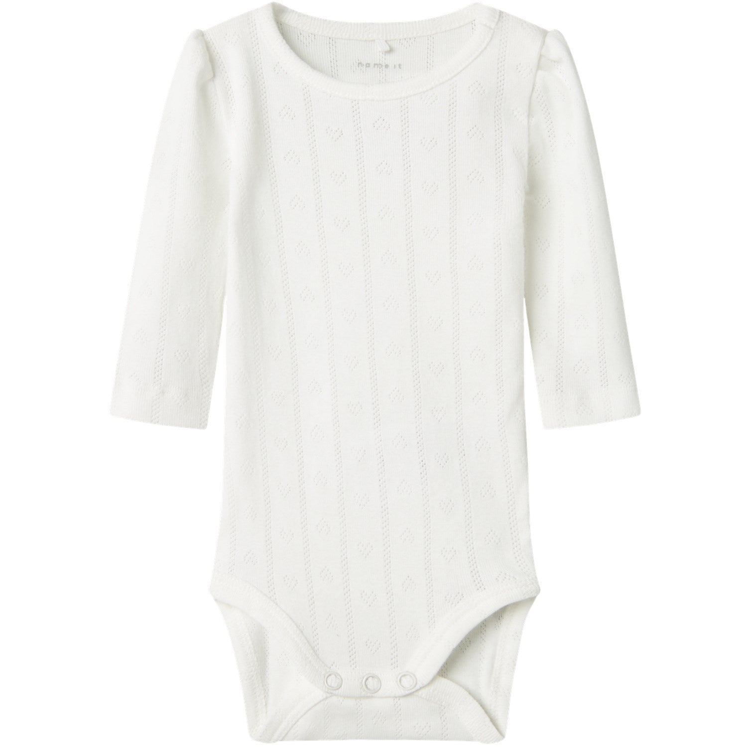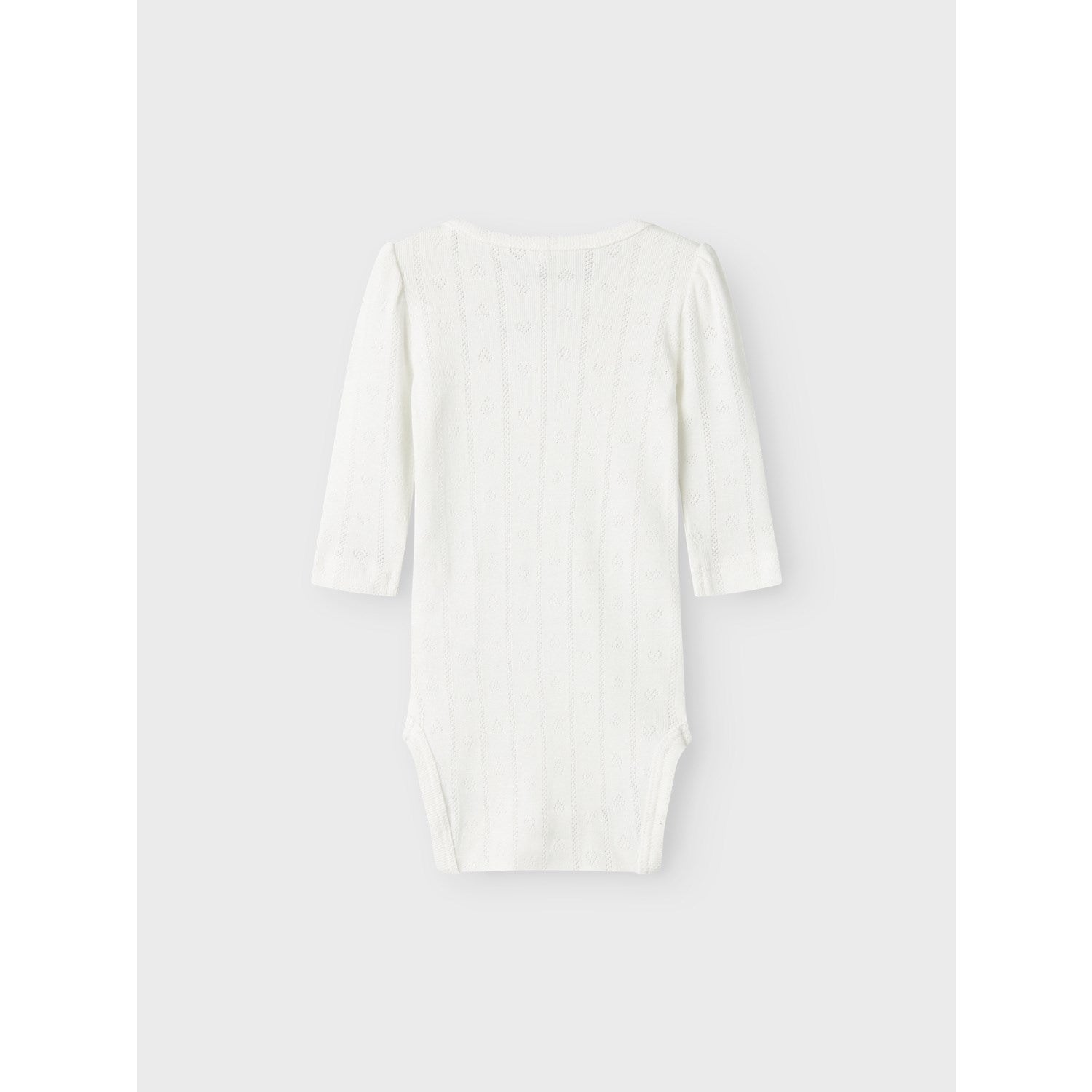 La barnet ditt nyte komforten med vår 'Name It Cloud Dancer Dagnes Body', en stilig og praktisk tilføyelse til enhver barnegarderobe. Denne bodysuiten er laget av delikat pointelle-strikk med et åpent og geometrisk mønster som gir et sofistikert preg. Med sin rene farge, "Cloud Dancer", og elegante puffermer, kombinerer denne bodyen både stil og funksjonalitet.