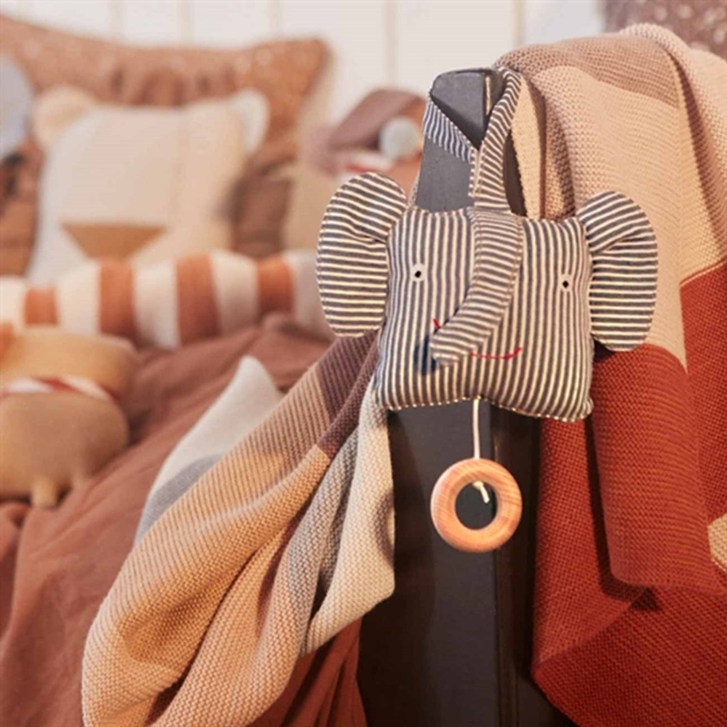Den søteste og fineste musikkmobilen fra OYOY. Denne er en søt liten elefant med striper med søte detaljer. Inviterer til mange fine og rolige stunder ved leggetid.