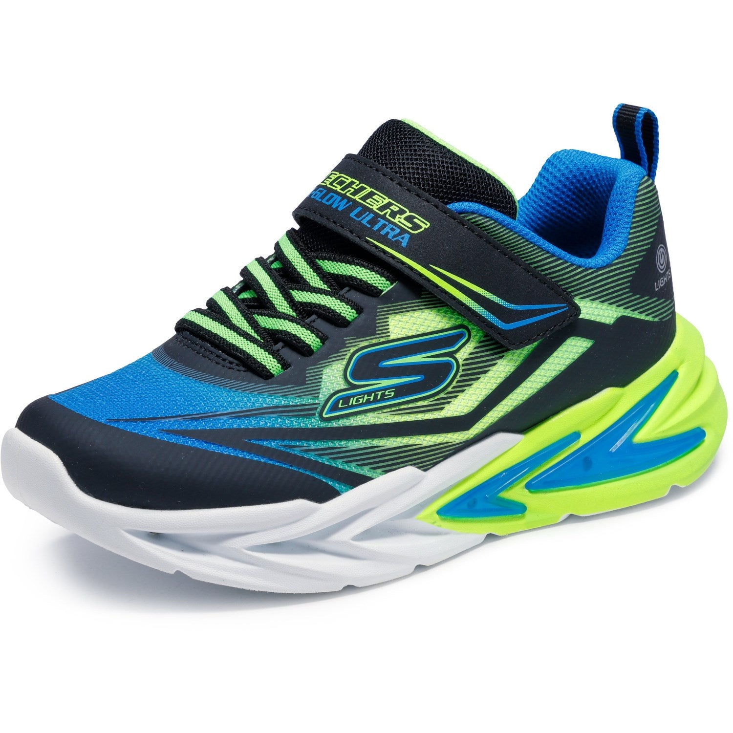 Skechers' innovative Adaptive Closure system tilpasser seg barnets fot for optimal komfort og støtte, mens den teknisk designete og luminøse mellomsålen ikke bare gir et kult lysende effekt men også bidrar til synlighet i mørket. En fleksibel yttersåle sørger for godt grep under alle slags lekeforhold.