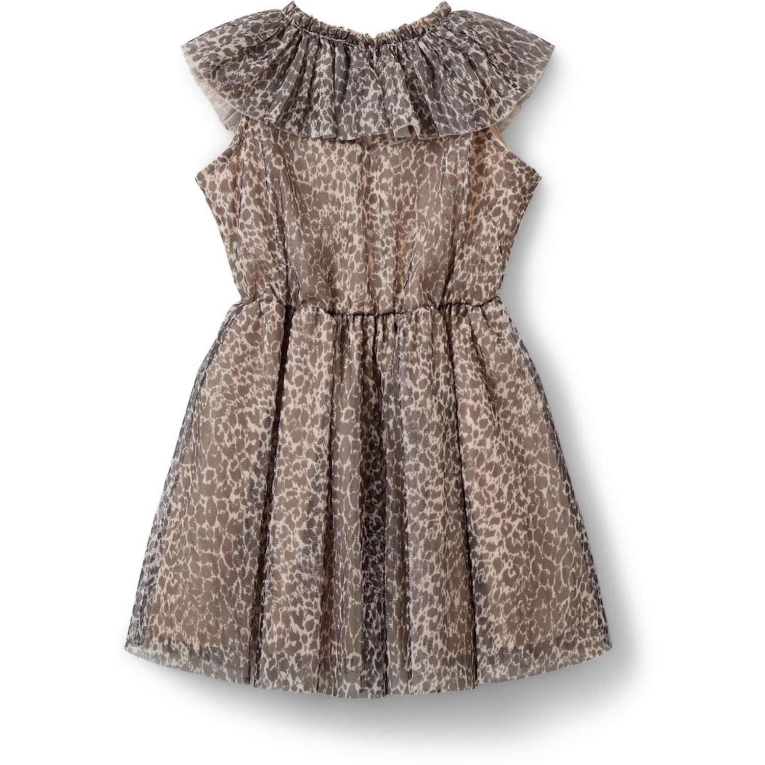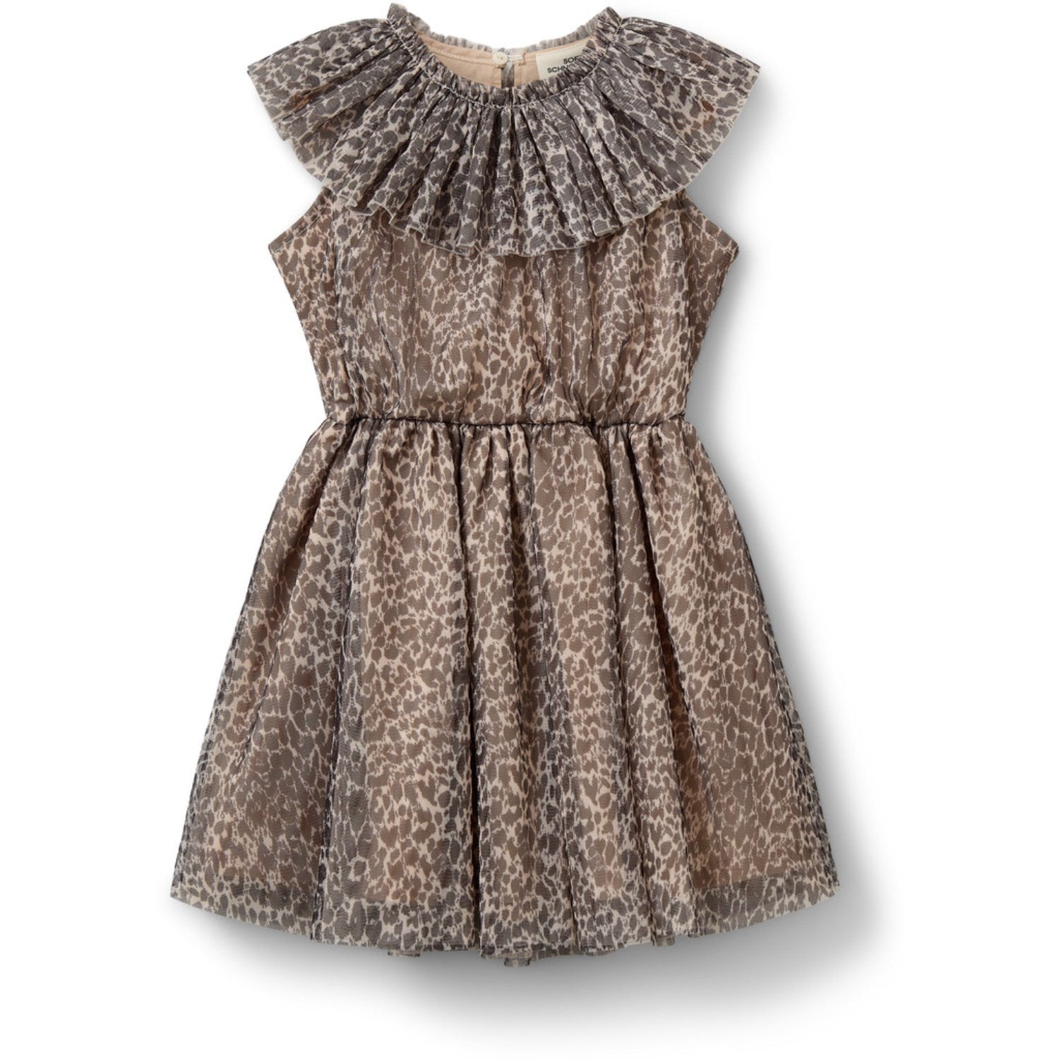 Snurr hele dagen i Sofie Schnoor Aop Leo Light Sand Jaimekb Dress! Perfekt for små moteentusiaster, denne ermeløse tyllkjolen har en leken A-linje som er perfekt for spinning og dans. Den store plisserte volangkragen gir et snev av eleganse, mens knappelukkingen i halsen gjør det enkelt å pynte seg. Enten det er en fest eller lekeavtale, vil denne kjolen garantert imponere!