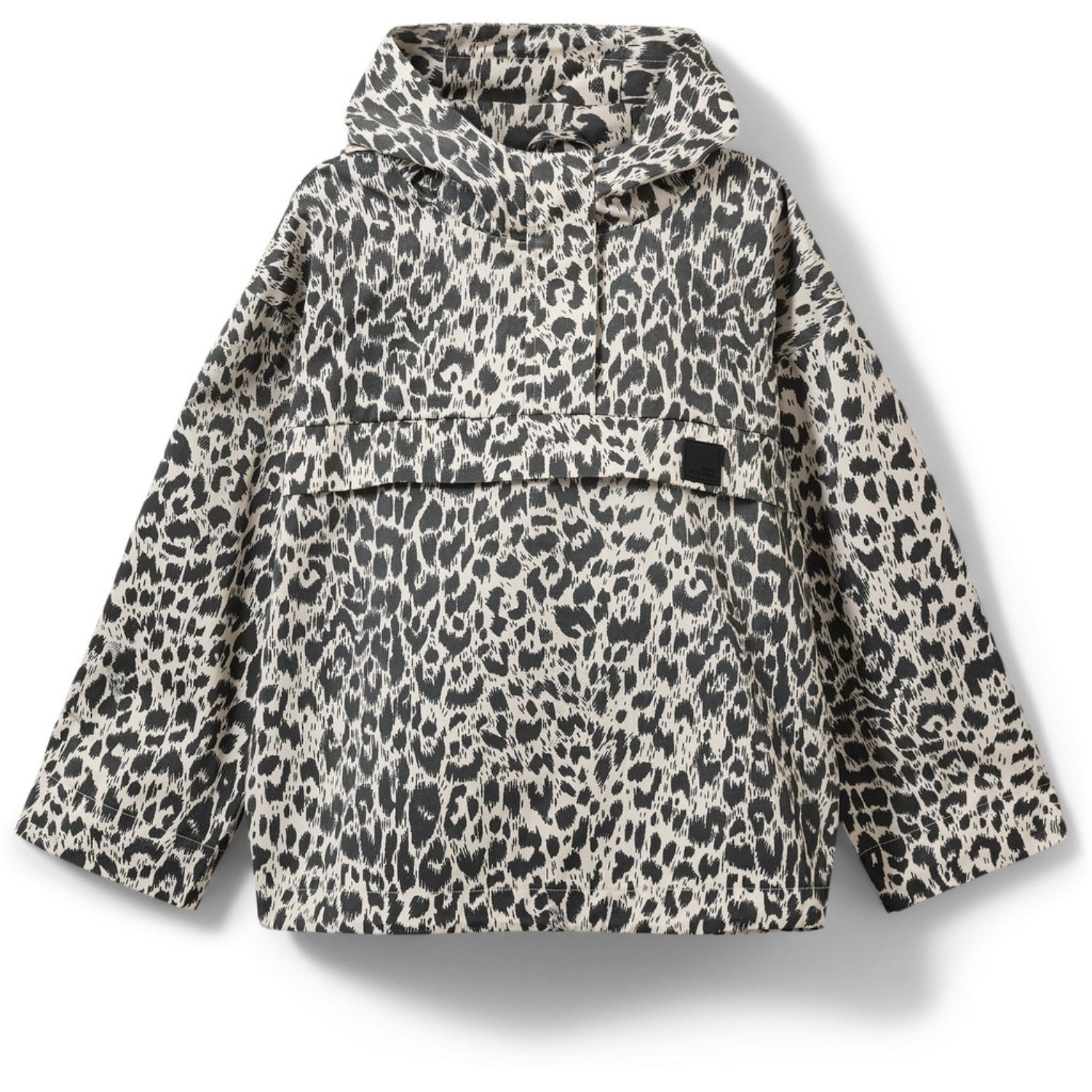 - Ekstra: Anorak-stil med halv glidelås/knappelukking foran, fast hette, vindklaff over brystet, rett nederste kant, liten logolapp på brystet
