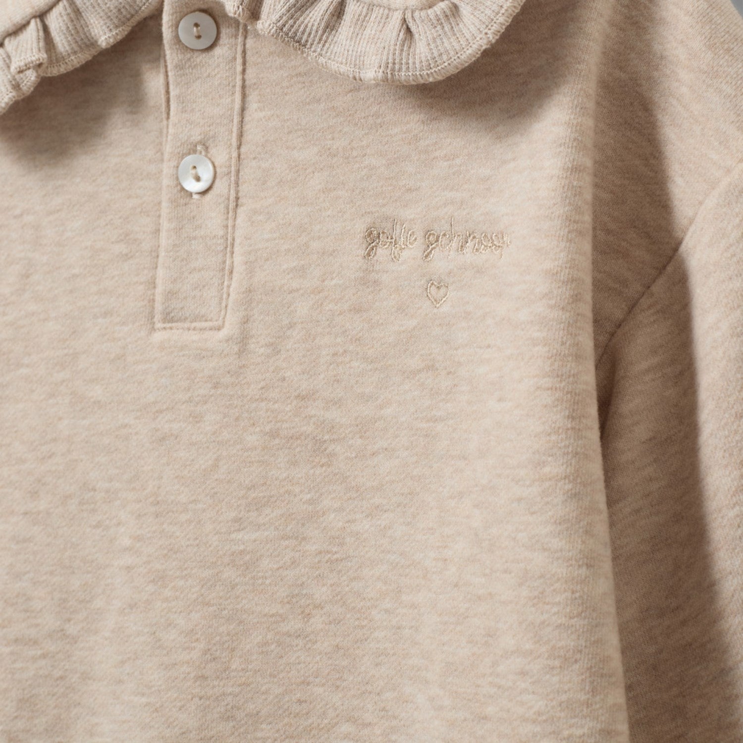 Hold den lille komfortabel og stilig med Sofie Schnoor Beige Melange Eliskb Sweatshirt. Designet med myk bomullsjersey for ultimat komfort, har denne løstsittende genseren stilige ribbede kanter ved ermene og falden. Den elegante kragen har en bred volangkant og en praktisk knappelukking foran, mens herlig tone-til-tone-broderi tilfører et snev av lekenhet med en subtil signatur fra «Sofie Schnoor» og et søtt lite hjerte på brystet. Perfekt for lekne eventyr eller en koselig dag inn!