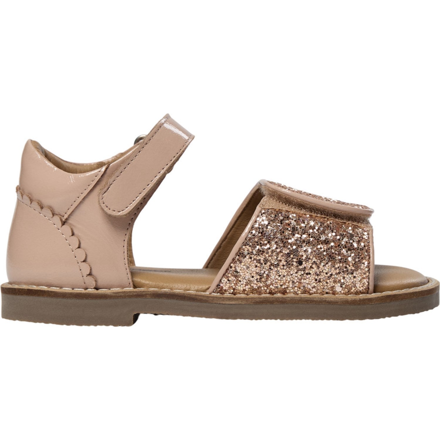 - Ekstra: Dekorative bølgete kantdetaljer ved hælen, justerbar borrelås ved ankelen, lukket hæl og åpen tå