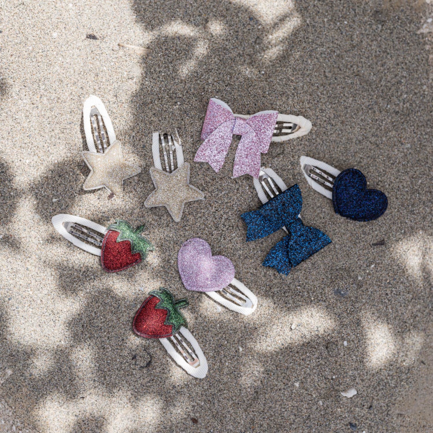 Settet inneholder åtte individuelt designede spenner i en rekke glitrende farger som fanger øyet. Med så mange valgmuligheter, kan barna enkelt matche spennene med ulike antrekk eller bruke dem til å skape spennende nye frisyrer. Hver spenne er utformet med tanke på både komfort og holdbarhet, slik at de ikke bare ser flotte ut, men også er behagelige å ha på og slitesterke nok til daglig bruk.