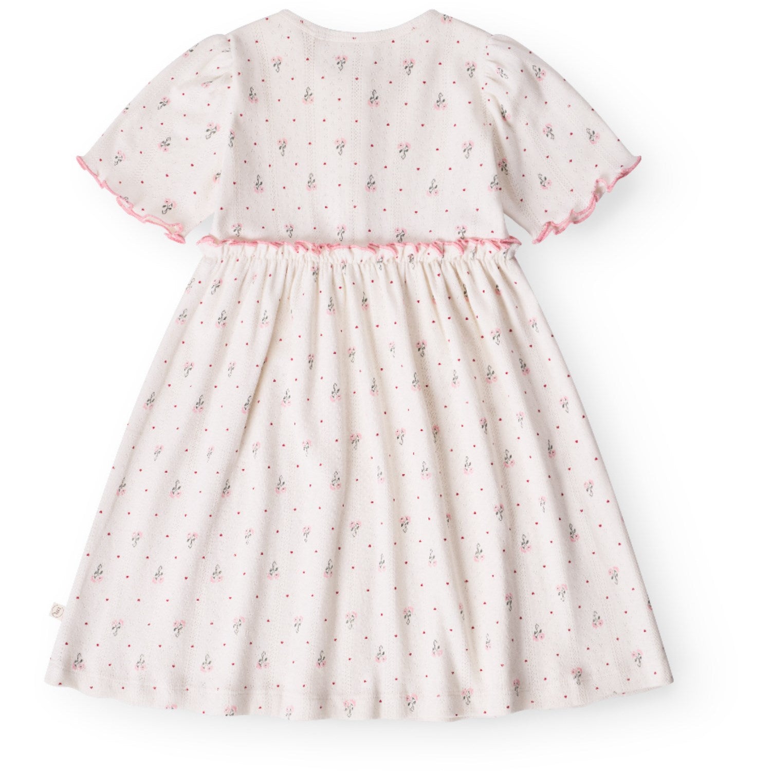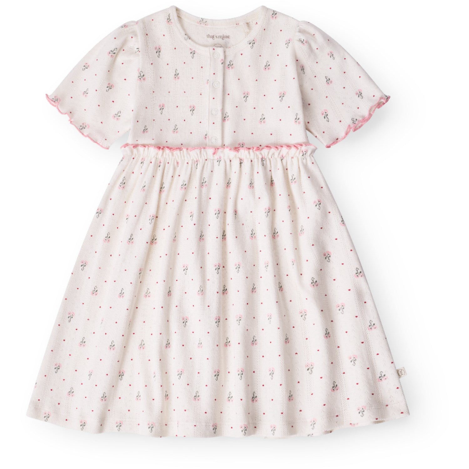 Oppdag gleden ved "That's Mine Blooming Love Glorie Kjole", en kjole i økologisk bomull som kombinerer stil med komfort. Med sitt sjarmerende, heldekkende mønster Blooming Love og smarte trykknapper for enkel påkledning er den ideell for både daglig bruk og festlige anledninger. Den elastiske linningen gir frihet til lek og bevegelse, mens det myke materialet forsikrer om at barnet kjenner seg godt tilpass. Kjolen er et økovennlig valg som står i stil med tidsånden!