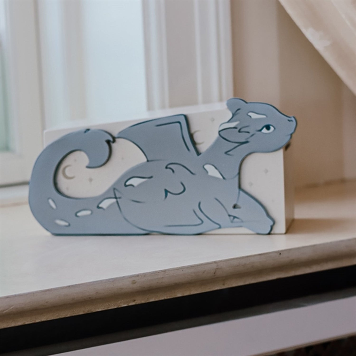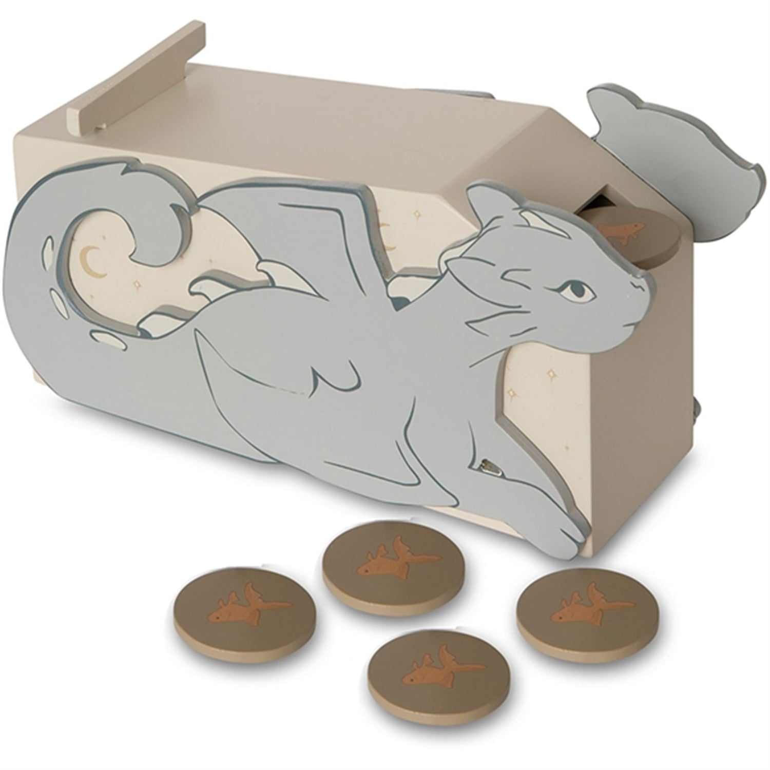 Tre kubeboks.Søt og morsom drageboks. Mat den lille dragen med gullfiskmynter.Den lille lunadragen er glad i gullmynter, og nå kan barna være med å mate henne.Dragen spiser myntene, inne i boksen er det et brett som har en skråning som gjør at myntene flyr ut igjen ved dragens hale.