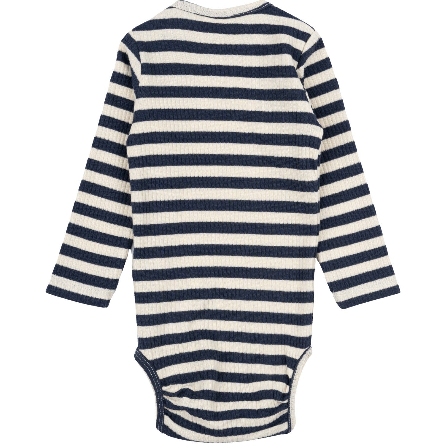 Oppdag den sjarmerende THE NEW Siblings Mood Indigo Striped Fro Uni Rib Body, perfekt for både lek og hvile. Denne bodyen er laget av myk ribbestrikket materiale som tilbyr en behagelig passform og varighet. Med sitt lekne stripemønster i indigoblått og stilig design, vil den garantert falle i smak. Bodyen er lett å ta av og på takket være praktiske funksjoner, ideell for travle foreldre. En flott kombinasjon av stil, komfort og kvalitet som vil holde seg vakker vask etter vask.