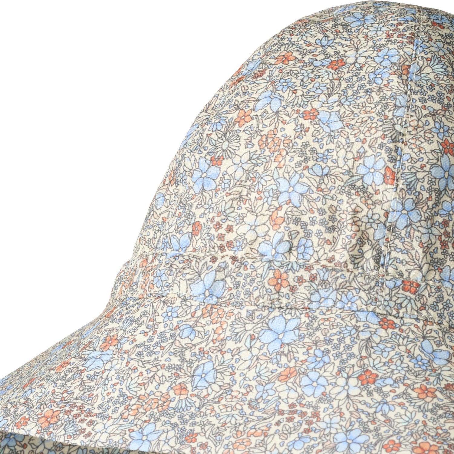 Designet med en sjarmerende blomstermønster i friske blåfarger, legger dette til en estetisk appell som er både munter og tiltalende. Hattens funksjonelle design inkluderer en praktisk båndsnor bak for en tilpasningsdyktig passform, samt slipssnorer under haken som holder hatten stødig på plass selv i bris. Med en forlenget bakside gir den ekstra beskyttelse mot solen, ideelt for å holde den sensitive nakken til din lille skjermet.