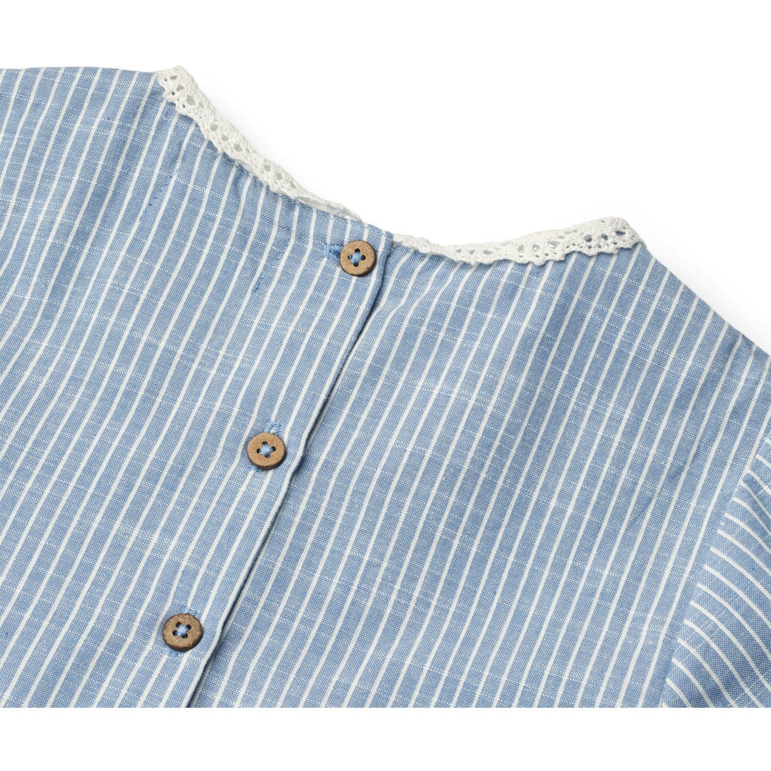 Sett seil på et hav av stil med Wheat Blue Stripe Dress S/S Elma! Denne sjarmerende kortermede kjolen, laget av 100 % GOTS-sertifisert økologisk bomull, er perfekt for din lille oppdagelsesreisende. Den har lekne striper, en delikat blondekrage i bomull og luftige vide ermer for bevegelsesfrihet. Den er designet med komfort i tankene, og har en flatterende snittlinje over midjen som fører til et forsiktig rynket skjørt. I tillegg er det en lek å kle seg opp takket være den praktiske knappelukkingen bak. Enten det er for en solrik dag ute eller en luftig kveld, passer denne kjolen fantastisk sammen med sandaler eller leggings og en koselig strikk.