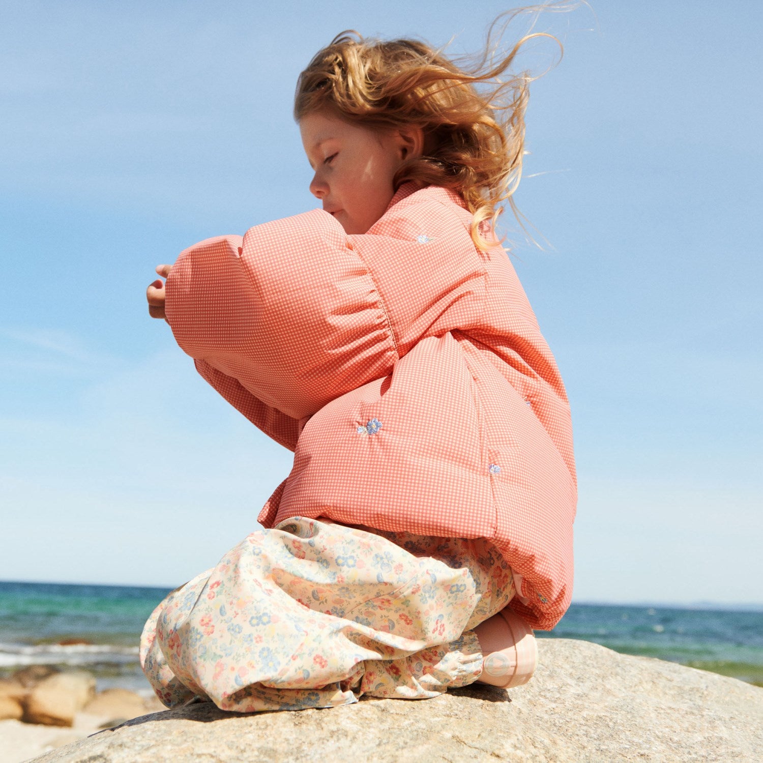 Gled ditt barn med vår Wheat Red Check Lightweight Puffer Jakke Sola, en perfekt blanding av stil og funksjonalitet for vårens eventyr. Denne jakken, med sin livlige, rutete design og dekorative blomsterbroderier, tilbyr en modern og frisk stil som skiller seg ut i barnegarderoben.