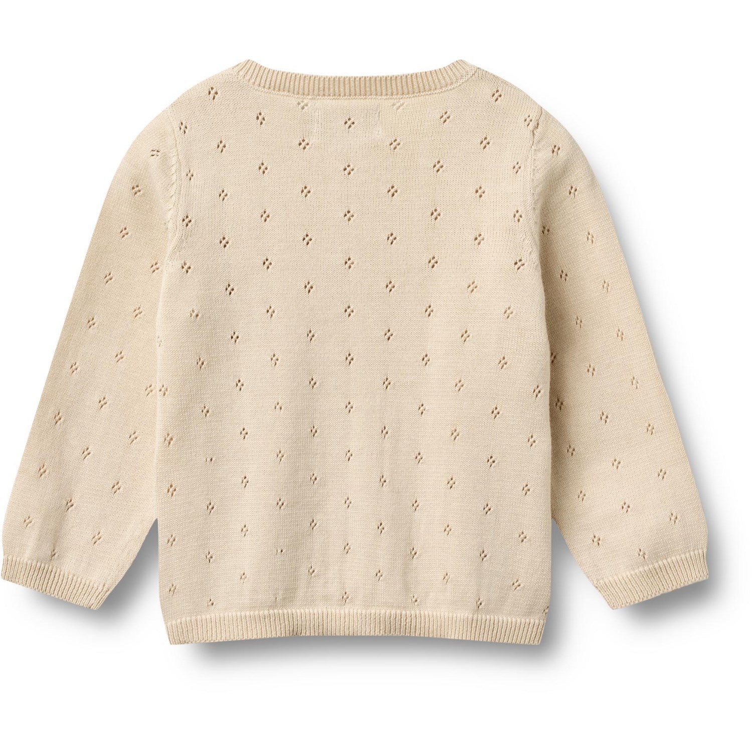 Oppdag den sjarmerende Wheat Sandshell Strikk Cardigan Maia, et must-have for enhver babygarderobe. Denne langermede cardiganen i A-form er laget av 100 % økologisk bomull, sikrer både komfort og kvalitet. Det delikate sweet lace-mønsteret gir et herlig uttrykk, mens de praktiske knappene foran letter påkledningen.